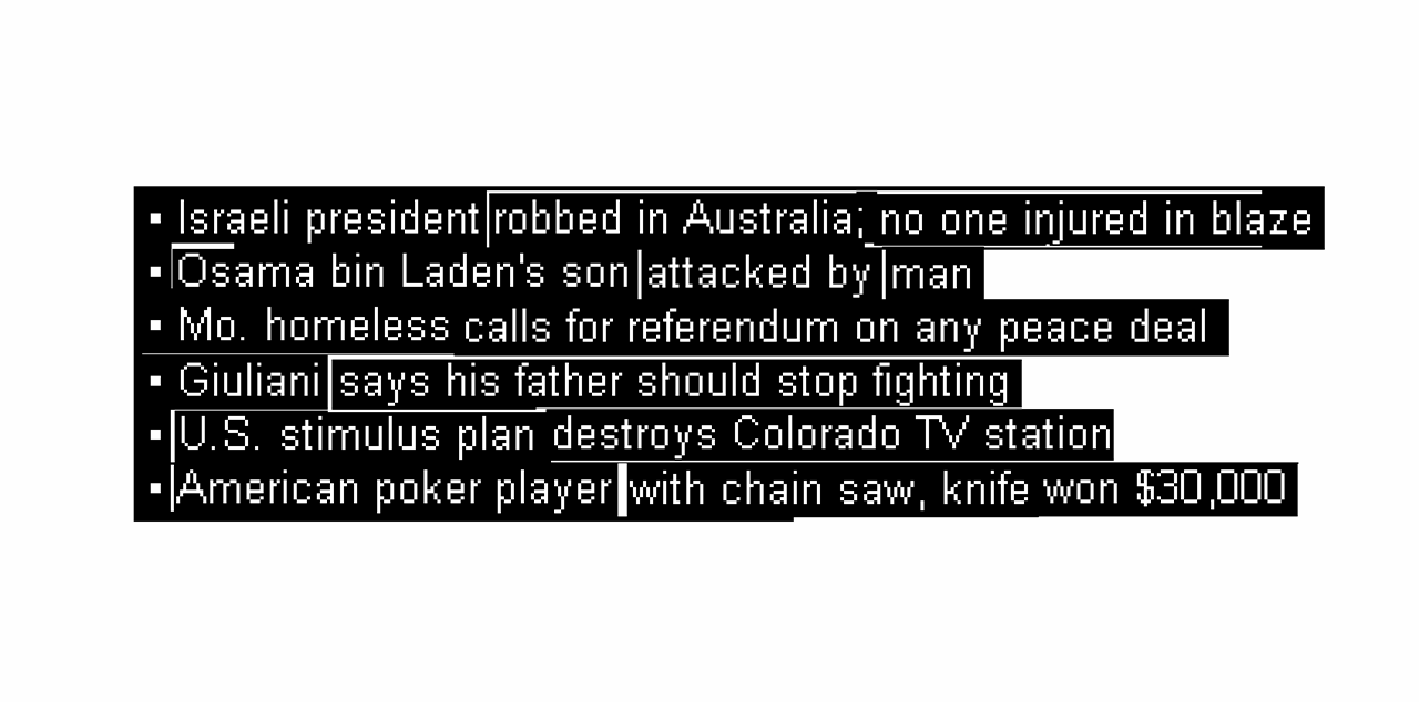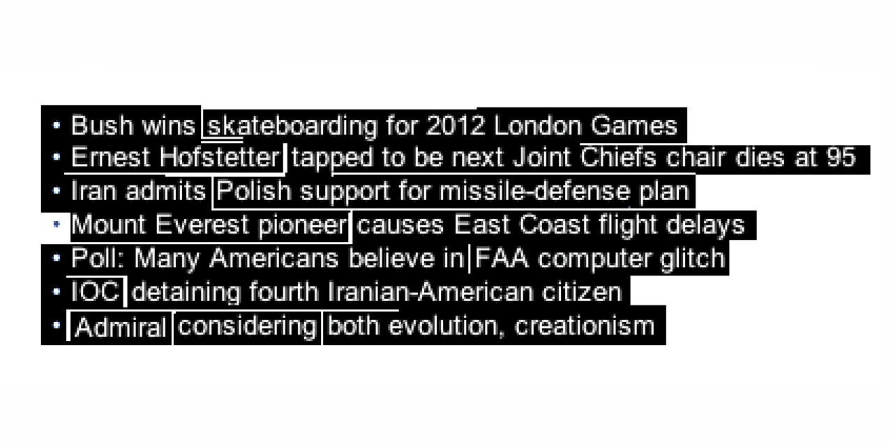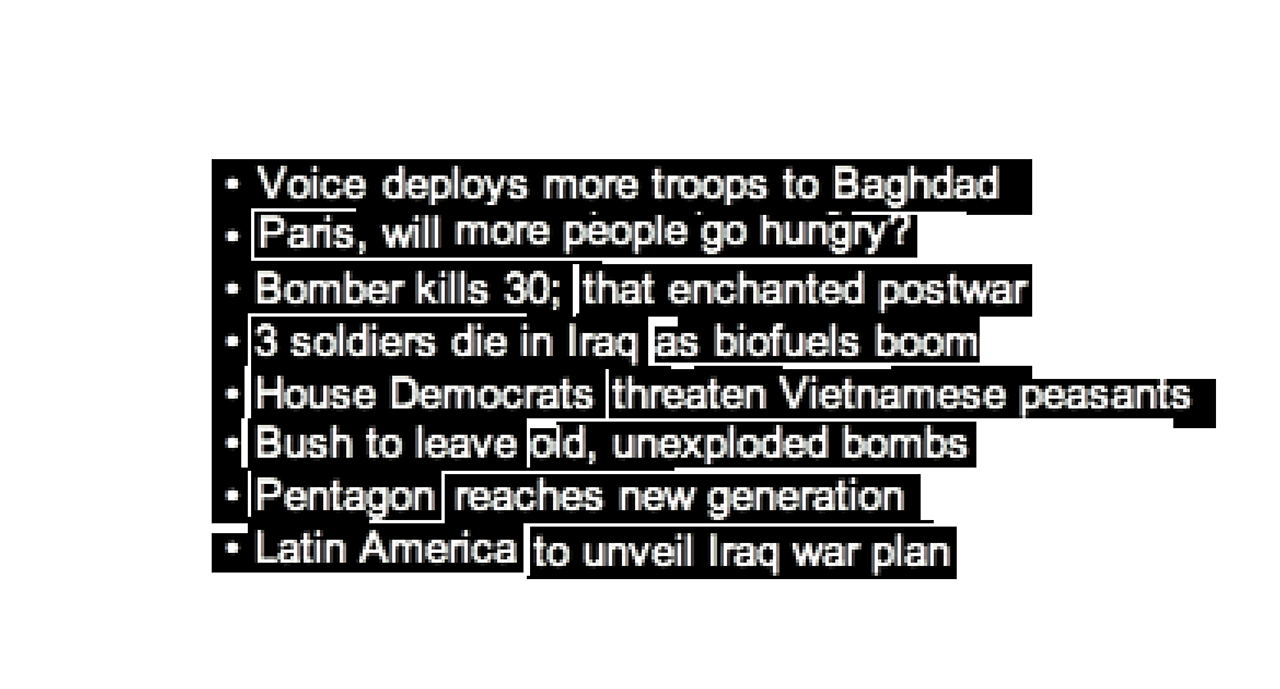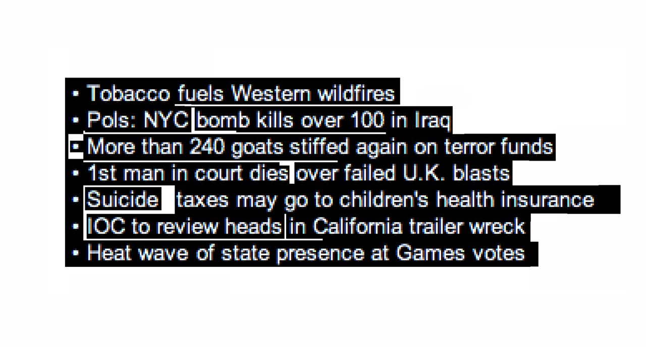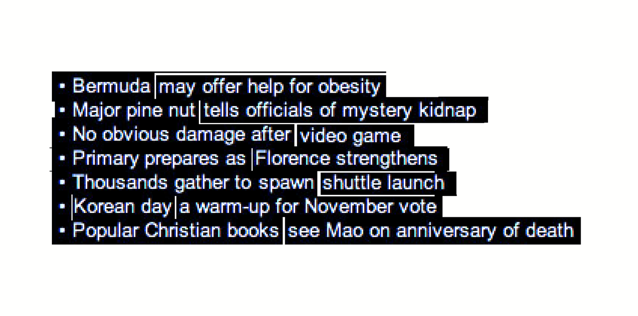During the years 2007 and 2008 I took screenshots of top Yahoo News stories, then scrambled the words to create almost nonsensical headlines.